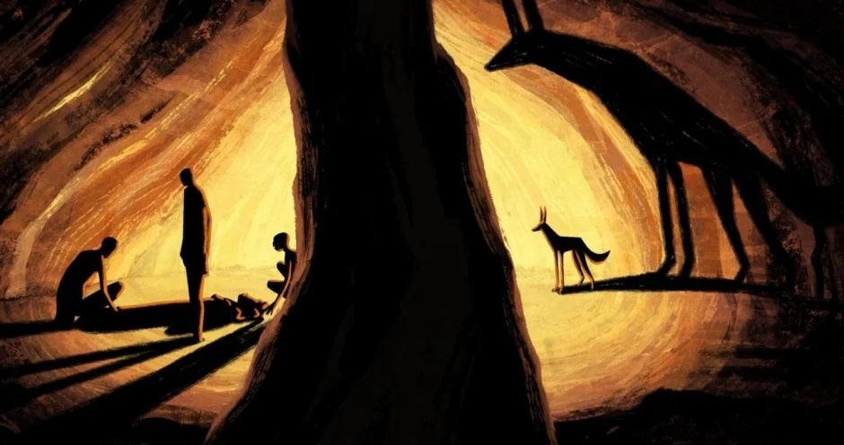 Figure 1. Nayola in the cave sequence with abstract figures and the canine presence. Nayola (2022), dir. José Miguel Ribeiro. Image source: Animation World Network. Available at: https://www.awn.com/animationworld/jos-miguel-ribeiro-talks-nayola-and-contagious-effects-war