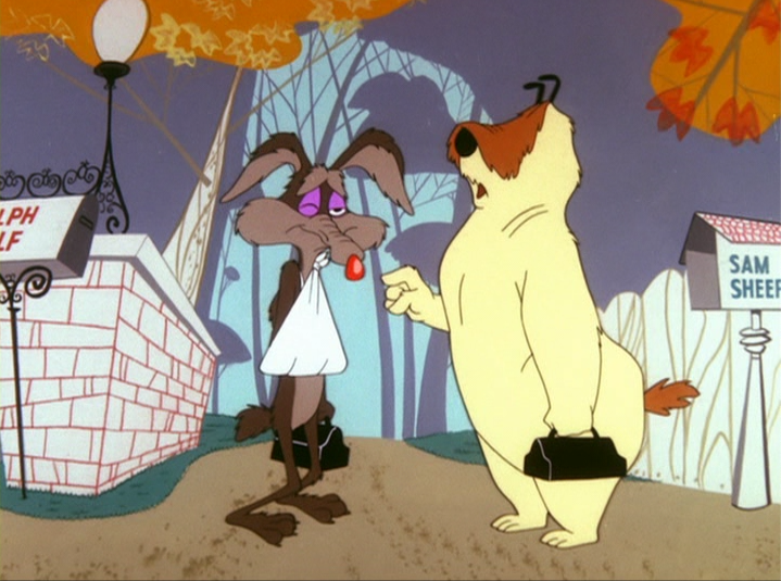 As Sam and Ralph start their day, they stop to clock in. In this scene, the gag of the pastoral task oriented work of the sheepherder that has been finally turned on its end and converted into a form of factory discipline is complete. The humor is unmistakable, as almost everyone can relate to having employment in a factory or industrial type setting in the 1950s with the increase in consumerism and industrialization.