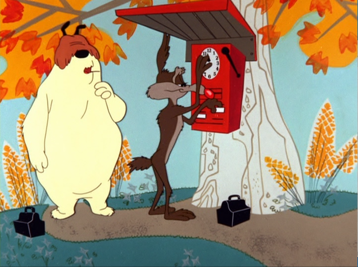 At the start of the film is the view of an almost storybook version of a suburban 1950’s abode. As the camera pans it stops and moves in for a closer medium shot through a bedroom window. All that is seen here is a nightstand table with an alarm clock sitting prominently in the shot. It suddenly shakes and dances as the sound effects trigger the alarm. Feet appear and toes wiggle as Sam Sheepdog rolls out of bed and yawns, stretches, and scratches. The clock starts his day. He lives his day in clock measured time. Sam’s world is monitored by factory discipline. Yet the house and surroundings stand deep in forest. Grass, flowers, and trees remind the viewer that industrialization and commodification can infiltrate any environment. That capitalism can use quantitative time to subvert the natural would and the task oriented work it once favored. As Sam exits his home, he greets Sam with a “Good Morning, Sam,” to which Ralph replies, “Good morning, Ralph.” The two are cordial co-workers.